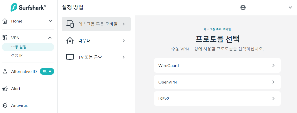 서프샤크 대시보드 -> VPN -> 수동설정 -> 데스크톱 혹은 모바일 -> WireGuard를 누릅니다. '키 쌍이 없습니다'를 누르고 이름을 적는 칸이 나오면 임의의 이름을 설정합니다. '새로운 키 쌍 생성'을 누릅니다. 그 다음으로 본인이 사용할 VPN 서버 국가를 고릅니다.