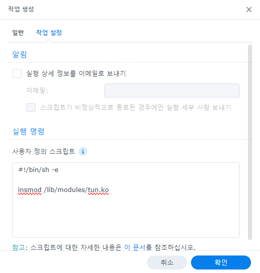 VPN이 작동하려면 시놀로지에서 TUN 스크립트 설정을 해줘야합니다.