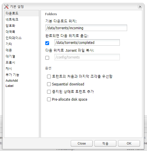 | 완료되면 다음 위치로 옮김 | /root/Downloads | /data/torrents/completed |