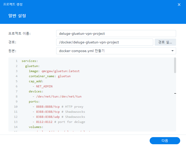 '프로젝트 이름'은 'deluge-gluetun-vpn-project'로, '경로'는 제일 처음 만들었던 'deluge-gluetun-vpn-project' 폴더로 설정합니다. '원본'은 'docker-compose.yml 만들기'로 선택합니다. 이제 회색 칸 안에 텍스트를 작성할 수 있습니다. 아래 텍스트를 복사 붙여넣기 합니다.