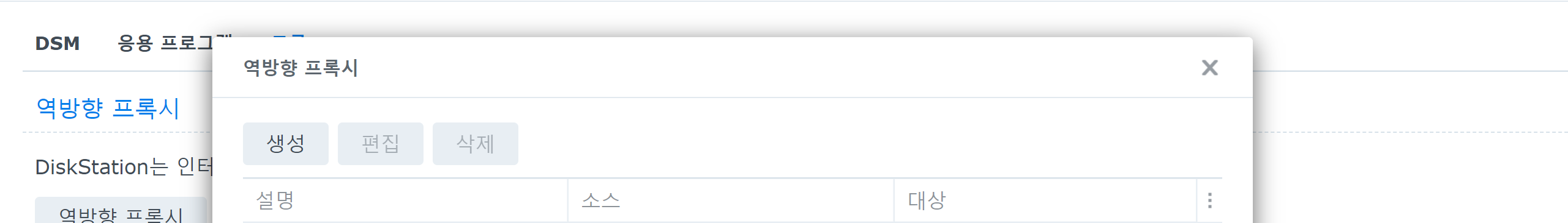 DSM 페이지 -> 제어판 -> 로그인 포털 -> 고급 -> 역방향 프록시를 눌러줍니다.