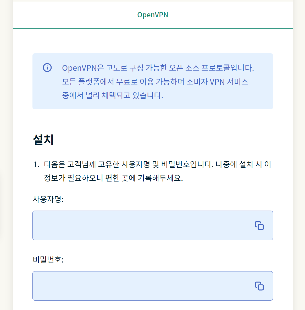 오른쪽 레이아웃 부분이 OVPN 구성 화면으로 바뀌면서 사용자명과 비밀번호가 나옵니다. 설치할 때 필요한 정보입니다. 메모장을 켜서 사용자명과 비밀번호를 기록해 둡시다.