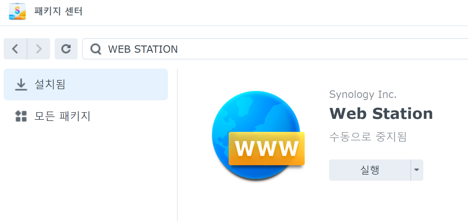 시놀로지 패키지 센터로 들어가서 Web Station과 Apache HTTP Server 2.4를 설치한 뒤 둘 다 실행합니다. (설치가 되면 자동으로 실행될 겁니다.)