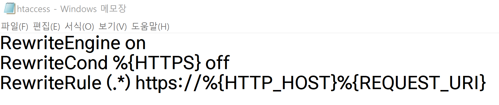 '다른 이름으로 저장'을 합니다. 파일 이름을 '.htaccess'로 바꾸고 파일 형식은 '모든 파일'로 바꿔주고 저장합니다.