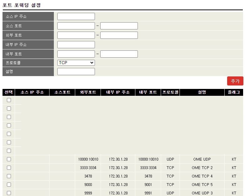 소스포트는 비워두고 외부 포트와 내부 포트는 사진에 적힌대로 적어주시면 됩니다. 내부 IP 주소는 나스 내부 IP 주소를 적으면 되겠죠. 프로토콜 설정을 특히 주의해야합니다. TCP와 UDP를 구분해야하기 때문입니다. 필요하다면 1935 포트(TCP)를 추가적으로 열어도 됩니다. 3000번 포트도 추가로 열 수 있다면 열어주세요.