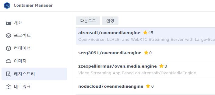DSM 7.2에서 도커가 컨테이너 매니저로 바뀌었죠. 컨테이너 매니저를 켜고 -> 레지스트리 -> ovenmediaengine 검색 -> latest 태그 버전으로 다운로드 받아줍니다.