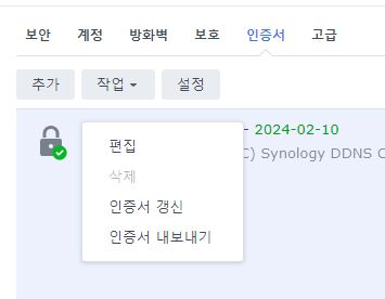 시놀로지 나스를 사용 중이시라면 대부분 *.synology.me 도메인을 사용하고 계실겁니다. 저도 마찬가지구요. 저는 해당 도메인을 사용해서 스트리밍 서버를 구축할 겁니다. 사용중인 인증서를 선택하고 오른쪽 클릭을 해서 '인증서 내보내기'를 누릅니다.
