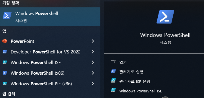 이제 윈도우에서 powershell을 검색해 실행합니다.